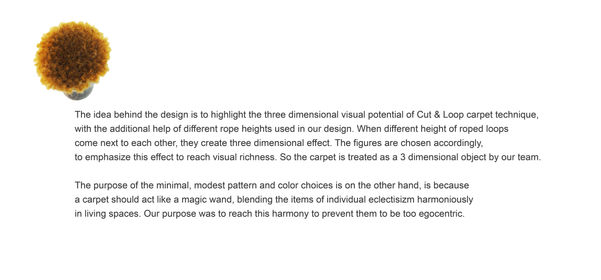 The figures have a naive design language, presenting early works of design process, just emerged on sketch papers. Only, this time our sketch papers are the carpet grounds made up so called of cut rope, the loops sunk into the ground symbolises scratched lines on the ground.